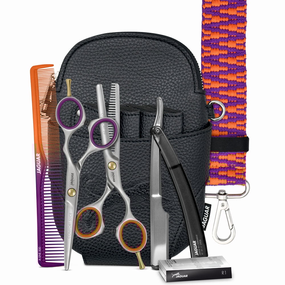 Professionele schaar en effileerschaar JAGUAR PRE STYLE Alle Sets bevatten: Professionele schaar en effileerschaar JAGUAR PRE STYLE Scheermes R1 M BLACK met metalen messenhouder voor standaard scheermesjes Incl. 10 mesjes R1 Knipkam A-LINE BICOLOR 7.25"" CROSSBAG (holster), formaat: B 21,5 x H 18,5 x D 3 cm.